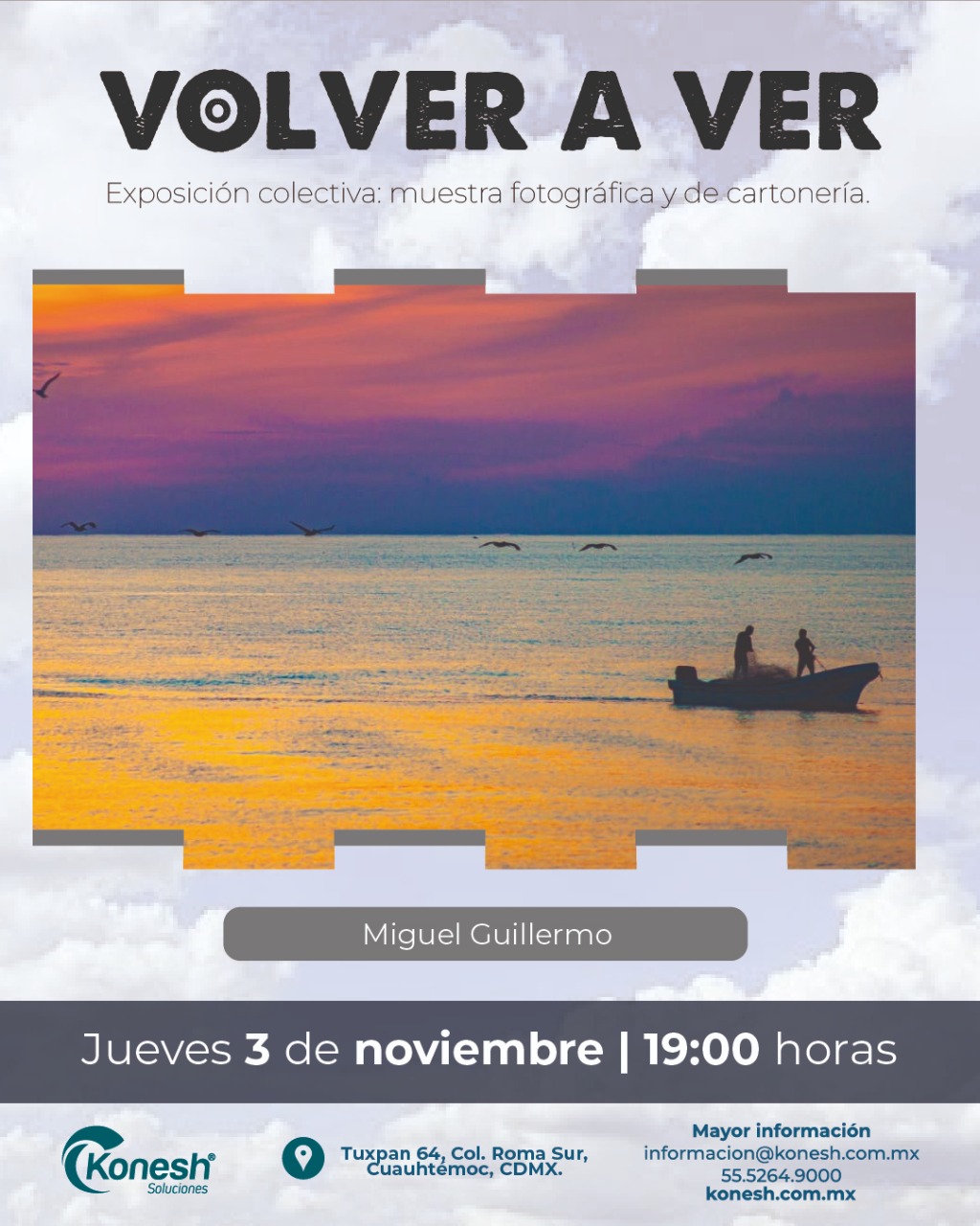 Con una rica muestra de seis artistas, Konesh Soluciones presenta una nueva exposición colectiva enfocada a fotografía y cartonería, con el sugestivo nombre de “Volver a ver”, la cual se llevará a cabo del 3 de noviembre de 2022 al 9 de enero de 2023 en la capital de la República Mexicana