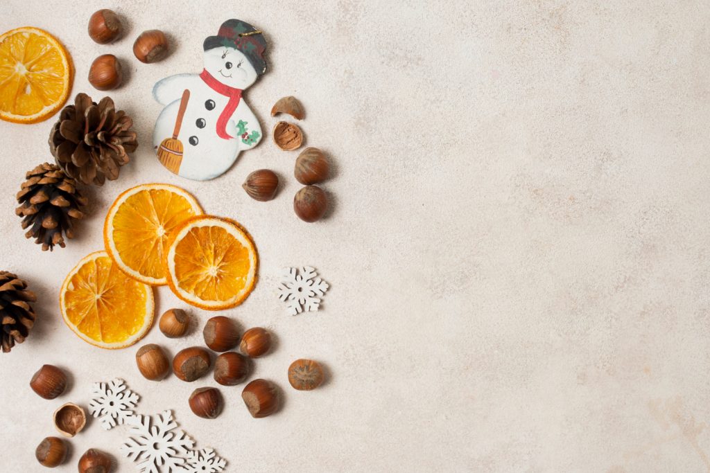 - Centros de mesa eco: utiliza piñas, ramas secas, frutas secas como naranjas, velas en recipientes reciclados o suculentas para decorar con un toque natural.